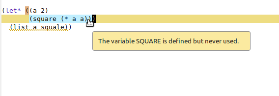 If you run the snippet in the REPL, you will get the two warnings but, because the snippet is run, you will see the interactive debugger with the error âThe variable SQUALE is unboundâ.